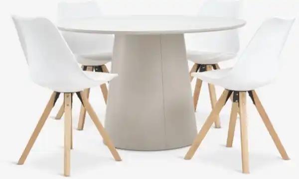 KLIPLEV Ø120 Tisch Travertin + 4 BLOKHUS Stühle weiß