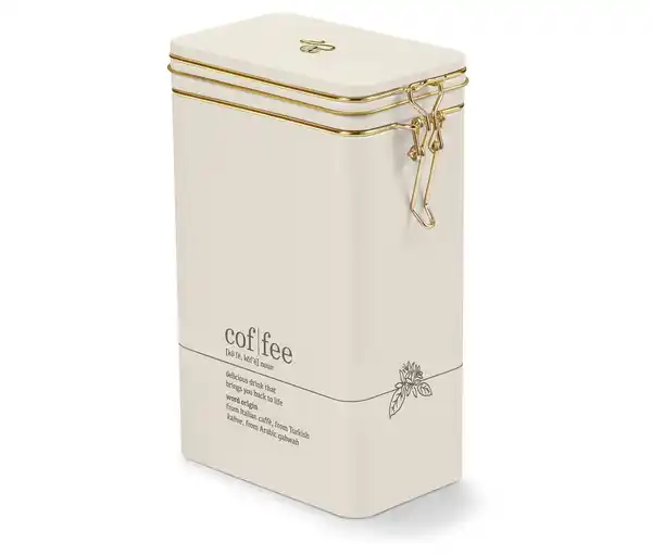 Kaffeedose, Coffee Dictionary Farbe: Deckel: Beige mit einer kleinen goldenen Tchibo Bohne Körper: Beige mit schwarzer Schrift Bügelverschluss: Gold Material: Weißblech Füllmenge: Für ca. 500 g Kaffee, als ganze Bohne oder gemahlen Kaffeedose aus WeißblechDicht schließender BügelverschlussFüllvolumen: ca. 500 g Kaffee (gemahlen oder ganze Bohne)