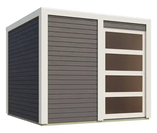 Karibu Gerätehaus »Quentin 1« mit Schiebetür und Dacheindeckung, 19 mm Farbe: Außenwände terragrau (RAL 060.40.05) Innenwände Holz naturfarben Tür- und Fensterrahmen, Zarge, Dachblenden und Eckleisten elfenbein (RAL 1015) Material: Massive nordische Fichte Seitenwände 19-mm-Wandbohlen, kesseldruckimprägnierte Bodenbalken. Türscheibe Kunstglas Maße: B x H x T außen ca. 246 x 214 x 246 cm Seitenhöhe ca. 201 cm Dach ca. 246 x 246 cm Firsthöhe ca. 214 cm Durchgangsmaß ca. 105 x 179 cm Inhalt: Inkl. Tür, 2 Schlüsseln, Fußboden, Dachfolie, Montagematerial und -anleitung Gewicht: Ca. 358,5 kg Gebrauchsanweisung: Aufbau nur zu zweit, durch fachkundige Personen Naturbelassene Holzstellen müssen behandelt werden Warnhinweise: Verwenden Sie bei der Montage und Wartung geeignetes Werkzeug und tragen Sie bei Bedarf Schutzausrüstung wie Handschuhe und eine Schutzbrille Technische Details: Kesseldruckimprägnierte Bodenbalken zum Schutz vor Witterungseinflüssen und holzzersetzenden Pilzen Tür mit verglasten Lichtausschnitten, Griffgarnitur und Zylinderschloss Wandstärke: 19 mm Dachform: Flachdach Bauweise: Steck-Schraub-System Tür: Schiebetür mit Kunstglas Schloss: Drehriegelschloss mit 2 Schlüsseln Sonstige Hinweise: Artikel wird zerlegt geliefert Lieferung in 3 Packstücken per Spedition Anlieferung bis Bordsteinkante Keine Inselbelieferung Zufahrt für 40-Tonner muss gewährleistet sein B x H x T Packstücke 1x ca. 123 x 40,5 x 240 cm, 1x ca. 30 x 28 x 240 cm, 1x ca. 13 x 12 x 106 cm Gewicht Packstücke 1x ca. 293 kg, 1x ca. 50 kg, 1x ca. 15,4 kg Exklusiv bei Tchibo: Fußboden und selbstklebende Dachfolie im Lieferumfang enthaltenMit großer, vormontierter Schiebetür, flexibel in Front oder Seite montierbarSchiebetür mit Milchglasfenstern aus Kunststoff für einen großzügigen TageslichteinfallTür abschließbar, Schloss und Schlüssel im Lieferumfang enthaltenKesseldruckimprägnierte Bodenbalken unter dem Fußboden zum zusätzlichen Schutz vor Witterungseinflüssen und holzzersetzenden Pilzen von untenFlachdach aus Massivholz für besonderen Schutz gegen WitterungseinflüsseEinfache Montage durch Steck-Schraub-System, für erfahrene DIY-Heimwerker geeignetAus hochwertigem nordischem FichtenholzDie terragraue Farbe schützt das Holz vor Witterung sowie UV-Strahlen, ist feuchtigkeitsregulierend und wasserabweisend, außerdem ist sie geruchslos und frei von allen bekannten problematischen SubstanzenMADE IN GERMANY