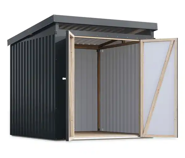 Karibu Metall-Gerätehaus »Anuke 2« Farbe: Anthrazit (RAL 7016) Material: Wände Trapezblech, polyesterbeschichtet Grundgerüst Leimholz Boden Massivholz Dach TrapezblechOberlicht Kunstglas Maße: B x H x T ca. 207 x 213 x 209 cm Seitenhöhe ca. 189,5 cm Dachmaß ca. 215 x 215 cm Durchgangsmaß ca. 141 x 174 cm Inhalt: Inkl. Fußboden, 2 Schlüsseln, Schrauben und Beschlägen und Aufbauanleitung Gewicht: Ca. 337 kg Warnhinweise: Schnittgefahr: Die Metallkomponenten können scharfe Kanten aufweisen. Die Montage ausschließlich mit Handschuhen durchführen. Verwenden Sie bei der Montage und Wartung geeignetes Werkzeug und tragen Sie bei Bedarf Schutzausrüstung wie Handschuhe und eine Schutzbrille Technische Details: Wandstärke: 0,5-mm-Trapezblech Dachform: Pultdach aus Trapezblech Bauweise: Elementbauweise Tür: Doppelflügeltür Schloss: Zylinderschloss mit 2 Schlüsseln Sonstige Hinweise: Artikel wird zerlegt geliefert Lieferung in 2 Packstücken per Spedition Anlieferung bis zur Bordsteinkante Zufahrt für 40-Tonner muss gewährleistet sein Keine Inselbelieferung B x H x T Packstücke 1x ca. 120 x 40 x 220 cm, 1x ca. 60 x 20 x 202 cm Gewicht 1x ca. 300 kg, 1x ca. 37 kg Exklusiv bei Tchibo: mit MassivholzfußbodenNEU: modernes Metall-Gerätehaus mit innenliegendem LeimholzrahmenLeimholzrahmen ermöglicht die Montage von z.B. Regalsystemen im Inneren des Gerätehauses – ganz ohne im Metall zu bohrenWände und Dach aus polyesterbeschichtetem, langlebigem Trapezblech – besonders wartungsarm, UV- und korrisionsbeständig, farbstabil5 Jahre Garantie gegen DurchrostungExtrahohe Doppelflügeltür, für größere Gartengeräte geeignetTür abschließbar, Zylinderschloss und 2 Schlüssel im Lieferumfang enthaltenOberlicht aus bruchsicherem Kunstglas für einen natürlichen LichteinfallKesseldruckimprägnierte Fundamentbalken unter dem Fußboden zum zusätzlichen Schutz vor Witterungseinflüssen und holzzersetzenden Pilzen von untenLeimholz-Balken sind langlebiger und qualitativ hochwertiger als Massivholz-Balken: sie sind besonders widerstandsfähig gegenüber Witterungseinflüssen und haben eine höhere Formstablität und TragfähigkeitEinfache Montage durch Elementbauweise, für DIY Heimwerker geeignetMADE IN GERMANY