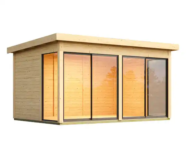 Karibu Modernes Gartenhaus »Noelia 5« mit Schiebetür und Dacheindeckung, 38 mm Farbe: Fichte naturfarben Tür- und Fensterrahmen anthrazit (RAL 7016) Material: Nordische Fichte Tür- und Fensterrahmen Aluminium, pulverbeschichtet Fenster 5-mm-Einscheibensicherheitsglas Maße: B x H x T außen ca. 428,5 x 253 x 308,5 cm Seitenhöhe ca. 199 cm Dachmaß ca. 466 x 330 cm Durchgangsmaß ca. 90 x 193 cm Inhalt: Inkl. 2 Fenstern, Aluminium-Schiebetür, Fußboden, Dachfolie, 2 Schlüsseln, Montagematerial und -anleitung Gewicht: Ca. 1.278,5 kg Warnhinweise: Verwenden Sie bei der Montage und Wartung geeignetes Werkzeug und tragen Sie bei Bedarf Schutzausrüstung wie Handschuhe und eine Schutzbrille Technische Details: Wandstärke: 38-mm-Rundprofil, Nut und Feder Dachform: Flachdach aus Massivholz Bauweise: Steck-Schraub-System Tür: Aluminium-Schiebetür Schloss: Zylinderschloss mit 2 Schlüsseln Sonstige Hinweise: Artikel wird zerlegt geliefert Lieferung in 3 Packstücken Keine Inselbelieferung Anlieferung bis zur Bordsteinkante per Spedition Zufahrt für 40-Tonner muss gewährleistet sein B x H x T Packstücke 1x ca. 120 x 65 x 430 cm, 1x ca. 110 x 38 x 210 cm, 1x ca. 13 x 12 x 106 cm Gewicht 1x ca. 838 kg, 1x ca. 402 kg, 1x ca. 38,5 kg Exklusiv bei Tchibo: mit Massivholzfußboden und selbstklebender DachfolieTür abschließbar, Zylinderschloss und 2 Schlüssel im Lieferumfang enthaltenGroßzügige Tür- und Fensterelementen mit Aliminium-Fensterrrahmen und hochwertigem 5-mm-EinscheibensicherheitsglasSchiebetür mit Bürstendichtung zum Schutz vor Wind, Staub und InsektenTürrahmen und Dach-Abschlusswinkel aus Aluminium für erhöhte Stabilität, Witterungsbeständigkeit und LanglebigkeitKesseldruckimprägnierte Fundamentbalken unter dem Fußboden zum zusätzlichen Schutz vor Witterungseinflüssen und holzzersetzenden Pilzen von untenAus hochwertigem, witterungsbeständigem und langlebigem FichtenholzEinfache Montage durch Steck-Schraub-System, für DIY-Heimwerker geeignetExtrahohe Wandstärke von 38 mm für maximale Stabilität und spürbare Dämmwirkung (siehe Warenkunde)MADE IN GERMANY