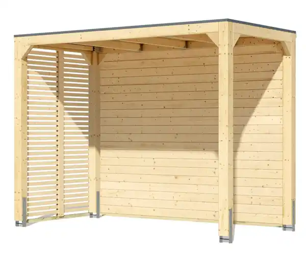 Karibu Pavillon »Markaska« mit Leimholz-Balken und Dacheindeckung, 320 x 160 cm, 28 mm Farbe: Holz naturfarben Material: Fichten-Leimholz Maße: B x H x T ca. 320 x 239 x 160 cm Inhalt: Inkl. 1 Seiten-Lamellenwand, 1 geschlossener Rückwand, selbstklebender Dachfolie, Montagematerial und -anleitung. Pfostenanker sind nicht im Lieferumfang enthalten und müssen separat erworben werden Gewicht: Ca. 142 kg Sonstige Hinweise: Artikel wird zerlegt geliefert Keine Inselbelieferung Lieferung bis zur Bordsteinkante Zufahrt für einen 40-Tonnen-Lkw muss gewährleistet sein Lieferung in 3 Packstücken B x H x T Packstücke 1x ca. 60 x 42 x 315 cm, 1x ca. 65 x 30 x 296 cm, 1x ca. 60 x 20 x 225 cm Pfostenanker sind nicht im Lieferumfang enthalten und müssen separat erworben werden Garantiegeber: Karibu Holztechnik Herstellergarantie und Garantieumfang: 5 Jahre auf die Konstruktion, ansonsten 2 Jahre Räumlicher Geltungsbereich: Deutschland und Österreich Hersteller-Artikel-Nummer: 29059 Hersteller: Karibu Holztechnik GmbH, Eduard-Suling-Straße 17, 28217 Bremen E-Mail: info@karibu.de Hochwertiger Leimholzpavillon mit Flachdach, als stilvolle Wohlfühloase oder funktionaler Unterstand nutzbarExklusives Tchibo-Set: 1 geschlossene Rückwand und 1 Lamellen-Seitenwand im Lieferumfang enthaltenRückwand und Lamellen-Seitenwand flexibel im Rahmen einsetzbarAlu-Abschlussleiste und selbstklebende Dachfolie im Lieferumfang enthaltenRostresistentes, langlebiges und stabiles AluminiumLeimholz-Balken sind langlebiger und qualitativ hochwertiger als Massivholz-Balken: sie sind besonders widerstandsfähig gegenüber Witterungseinflüssen und haben eine höhere Formstabilität und TragfähigkeitHinweis: Pfostenanker sind nicht im Lieferumfang enthalten und müssen separat bestellt werdenMADE IN GERMANY