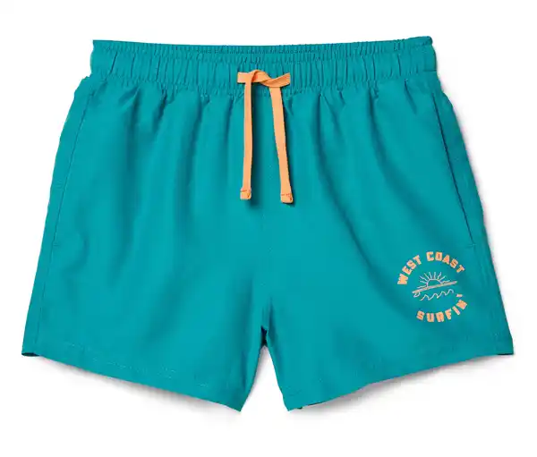 Kinder-Boardshorts Farbe: Türkis mit platziertem orangefarbenem Print Material: 100% Polyester Maße: Innenbeinlänge ca. 10 cm (Gr. 134/140) Sonstige Hinweise: Größenlauf/Alter: Gr. 122/128 (ca. 6 – 8 J.) Gr. 134/140 (ca. 8 – 10 J.) Gr. 146/152 (ca. 10 – 12 J.) Gr. 158/164 (ca. 12 – 14 J.) Gr. 170/176 (ca. 14 – 16 J.) Bequemer Sitz durch innenliegende Mesh-HoseElastischer BundAngenehm leicht und schnelltrocknend2 Seitentaschen und aufgesetzte Gesäßtasche
