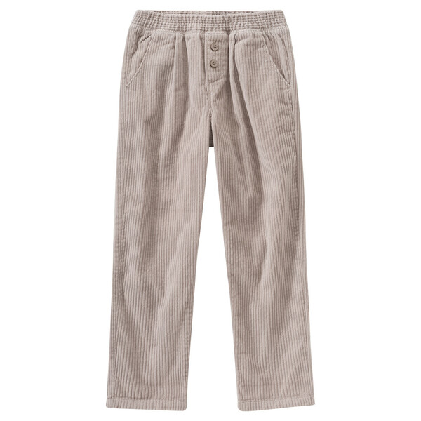 Ein Klassiker so trendy! Beige Hose aus weichem Cord mit zwei Einschubtaschen vorne und zwei Gesäßtaschen. Mit elastischem Bund, zwei Zierknöpfen vorne und gerade geschnittenem Bein.