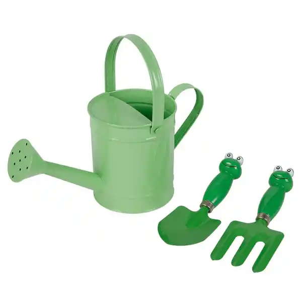 Mit dem sehr niedlichen Kinder-Gartenset, bestehend aus einer Gießkanne und zwei Gartenwerkzeugen mit Frosch-Griffen, können kleine Gärtner fleißig umgraben, einpflanzen und bewässern.