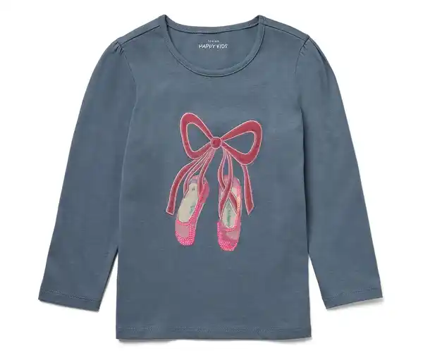 Kinder-Langarmshirt mit Puffärmeln Farbe: Mittelblau mit mehrfarbiger Ballerinaschuh-Applikation und Print Material: 100% Baumwolle Sonstige Hinweise: Größenlauf/Alter: Gr. 86/92 (ca. 12 – 24 M.) Gr. 98/104 (ca. 2 – 4 J.) Gr. 110/116 (ca. 4 – 6 J.) Gr. 122/128 (ca. 6 – 8 J.) Ballerina-Applikation mit SamtMit PuffärmelnAb Gr. 98/104 mit PaillettenGr. 86/92 mit 2 Druckknöpfen an der SchulterWeiche Single-Jersey-QualitätRundhalsausschnittGerade FormGOTS organic – in conversion, zertifiziert durch CU 809415Dieses Shirt fördert den Anbau nachhaltiger Baumwolle.