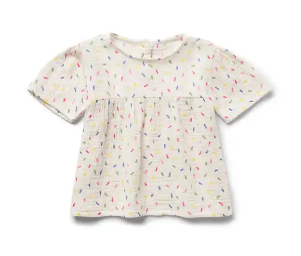 Kinder-Musselin-Bluse Farbe: Cremeweiß mit mehrfarbigem Streusel-Alloverprint Material: 100% Baumwolle (aus ökologischem Anbau) Maße: Gesamtlänge ca. 35 cm (Gr. 86/92) Sonstige Hinweise: Größenlauf/Alter: Gr. 74/80 (ca. 6 – 12 M.) Gr. 86/92 (ca. 12 – 24 M.) Gr. 98/104 (ca. 2 – 4 J.) Gr. 110/116 (ca. 4 – 6 J.) Gr. 122/128 (ca. 6 – 8 J.) Knopfleiste zum einfachen An- und AusziehenA-LinieLeichte, sommerliche Baumwoll-QualitätMehrfarbiger AlloverprintGOTS organic, zertifiziert durch CU 809415Diese Bluse schützt Wasserressourcen.
