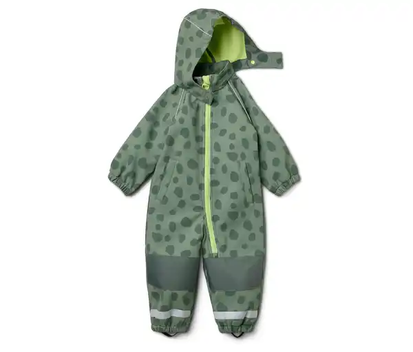 Kinder-Softshell-Einteiler Farbe: Dunkelgrün mit graugrünem Alloverprint Futter limettengrün Material: 90% Polyester, 10% Elasthan (Creora®) Futter und Oxford-Besätze 100% Polyester Maße: Innenbeinlänge ca. 39 cm (Gr. 98/104) Sonstige Hinweise: Größenlauf/Alter: Gr. 74/80 (ca. 6 – 12 M.) Gr. 86/92 (ca. 1 – 2 J.) Gr. 98/104 (ca. 2 – 4 J.) Gr. 110/116 (ca. 4 – 6 J.) Winddicht, wasserabweisend und atmungsaktivObermaterial hält einer Wassersäule bis 5.000 mm standWasserabweisend durch umweltschonende evoPel-ImprägnierungVerstärkte Einsätze aus Oxford-Gewebe an Knie und GesäßWeiches, wärmendes Microfleece-InnenfutterUnterlegter, wasserdichter Reißverschluss mit KinnschutzGr. 74/80 mit elastischen FußstegenAbknöpfbare KapuzeBeschreibbares NamensschildElastisches Obermaterial für hohen Tragekomfort und optimale BewegungsfreiheitMit dekorativen Reflektor-Elementen