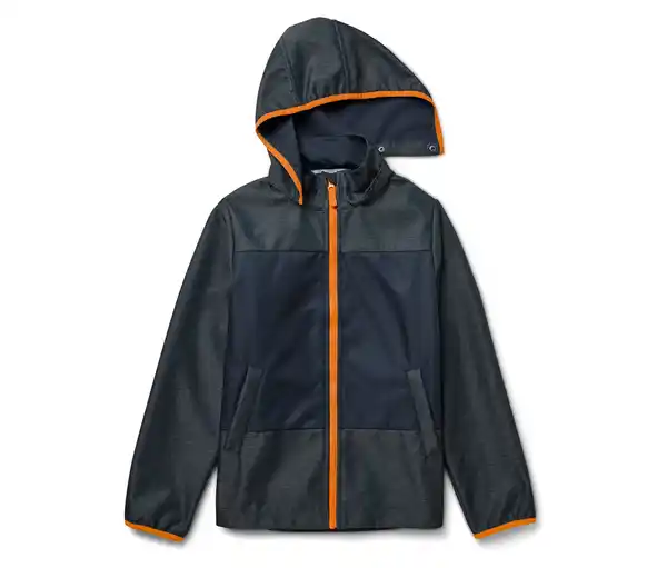 Kinder-Softshelljacke Farbe: Dunkelblau mit dunkelblauem Denimprint und orangefarbenen Details Material: 100% Polyester Sonstige Hinweise: Größenlauf/Alter: Gr. 122/128 (ca. 6 – 8 J.) Gr. 134/140 (ca. 8 – 10 J.) Gr. 146/152 (ca. 10 – 12 J.) Gr. 158/164 (ca. 12 – 14 J.) Gr. 170/176 (ca. 14 – 16 J.) Softshellware mit 3-Lagen-Laminat – winddicht, wasserdichtund atmungsaktivElastisches Obermaterial für hohen Tragekomfort und optimale Bewegungsfreiheit – hält einer Wassersäule bis 5.000 mm standMit umweltschonender evoPel-ImprägnierungAbknöpfbare KapuzeWasserfester Frontreißverschluss mit KinnschutzSoftshellware in Denimoptik2 Taschen auf der VorderseiteMit dekorativem Reflektorelement