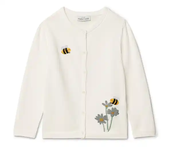 Kinder-Strickjacke Farbe: Weiß mit mehrfarbiger Stickerei Material: 100% Baumwolle Sonstige Hinweise: Größenlauf/Alter: Gr. 50/56 (ca. 0 – 2 M.) Gr. 62/68 (ca. 2 – 6 M.) Gr. 74/80 (ca. 6 – 12 M.) Gr. 86/ 92 (ca. 1 – 2 J.) Gr. 98/104 (ca. 2 – 4 J.) Gr. 110/116 (ca. 4 – 6 J) Gr. 122/128 (ca. 6 – 8 J.) Mit niedlichen StickereienRippabschluss an Ärmeln, Saum und KnopfleisteAus Bio-BaumwolleGOTS organic, zertifiziert durch CU 809415