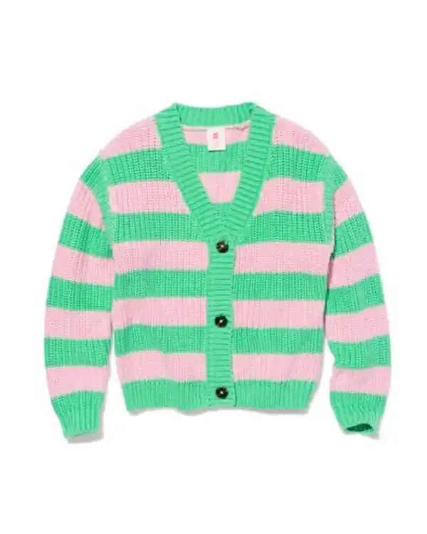 Diese Kinderstrickjacke mit Streifen ist besonders hübsch. Die Strickjacke hat einen V-Ausschnitt und wird mit Knöpfen geschlossen.