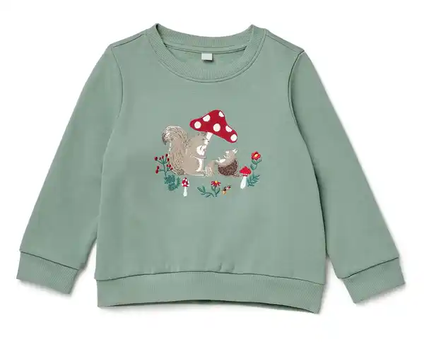 Kinder-Sweatshirt mit angerauter Innenseite, grün Farbe: Pastellgrün mit Pilz- und Waldtier-Applikation und mehrfarbigem Print Material: 60% Baumwolle (Unterstützt die Initiative Cotton made in Africa), 40% Polyester Sonstige Hinweise: Größenlauf/Alter: Gr. 50/56 (ca. 0 – 2 M.) Gr. 62/68 (ca. 2 – 6 M.) Gr. 74/80 (ca. 6 – 12 M.) Gr. 86/ 92 (ca. 1 – 2 J.) Gr. 98/104 (ca. 2 – 4 J.) Gr. 110/116 (ca. 4 – 6 J.) Gr. 122/128 (ca. 6 – 8 J.) Hautsympathisch durch hohen Baumwollanteil Gr. 50/56–86/92 mit Druckknöpfen an der SchulterWeich und wärmend durch angeraute InnenseiteUnterstützt die Initiative Cotton made in AfricaDieser Sweater unterstützt die Farmer*innen.