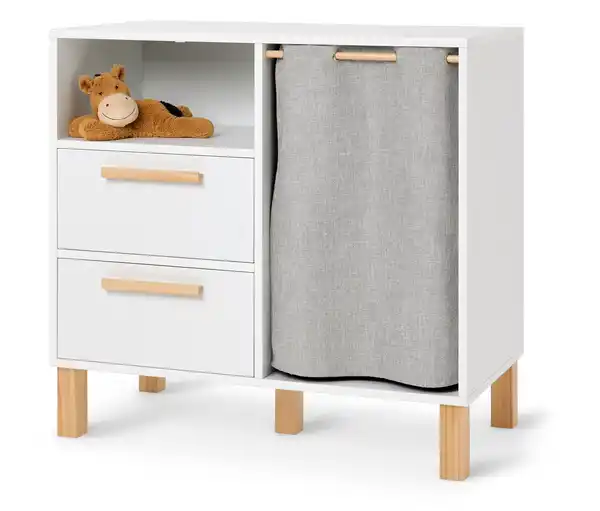 Kinderkommode »Leira« mit Schubladen und Kleiderstange Farbe: Korpus und Fronten weiß Griffe und Füße Kiefer naturfarben Vorhang grau Kleiderstange silberfarben Material: Korpus und Fronten FSC®-zertifizierte mitteldichte Holzfaserplatte (MDF), lackiert Griffe und Füße FSC®-zertifiziertes Kiefern-Massivholz, lackiert Kleiderstange Stahl, verzinkt Vorhang 98% Polyester, 2% Polyamid Maße: B x H x T ca. 95 x 90,3 x 50 cm B x H x T Schublade innen ca. 42 x 21,8 x 38 cm B x H x T offenes Fach groß ca. 42,7 x 71 x 48 cm B x H x T offenes Fach klein ca. 46,8 x 22,6 x 44,5 cm Inhalt: Inkl. Wandbefestigung, Bodenschonern, Montagematerial und -anleitung Gewicht: Ca. 44 kg Tragkraft: Ablage und Fächer je max. 15 kg Kleiderstange max. 3 kg Schublade max. 8 kg Sonstige Hinweise: Artikel wird zerlegt geliefert Lieferung in 2 Packstücken Dieses Produkt ist vielseitig mit anderen Möbeln aus der Serie kombinierbarStauraummöbel für das Kinderzimmer2 Schubladen mit Vollauszug und Soft-CloseKleiderstange zum Aufhängen von KleidungGriffe und Füße aus FSC®-zertifiziertem Kiefern-MassivholzKorpus und Schubladenfronten aus FSC®-zertifizierter MDF, lackiert Inkl. Wandbefestigung und Bodenschonern