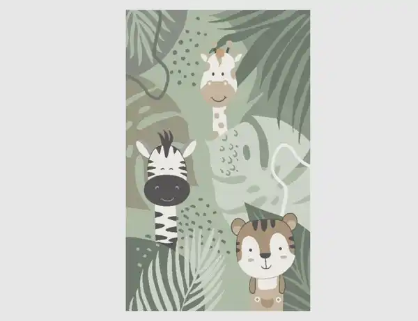 Dieser Kinderteppich mit Dschungelmotiv schafft eine lebendige Umgebung, in der Spielen, Lernen und Entspannen selbstverständlich zusammenfinden. Zwischen großflächigen Blättern und sanften Naturtönen entdecken Kinder freundlich illustrierte Tiere, die Fantasie und Neugier anregen. Die grüne Grundfarbe vermittelt Ruhe und unterstützt eine ausgewogene Raumwirkung im Kinderzimmer.