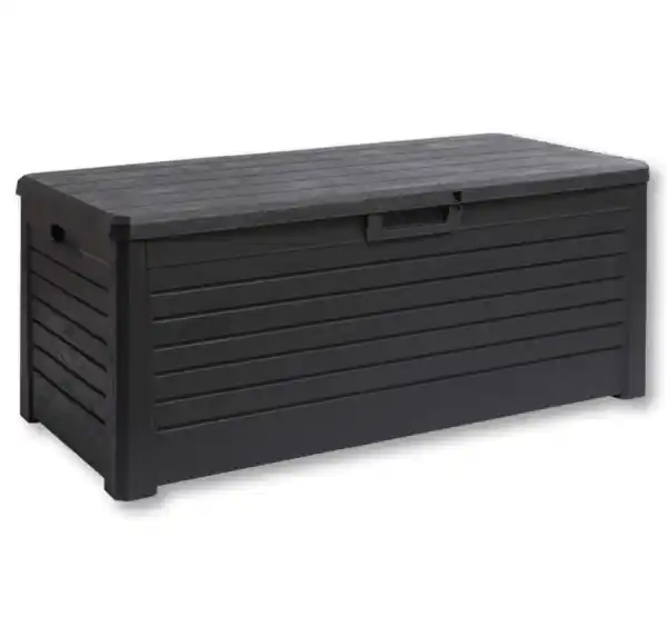 Holzoptik, anthrazit, 2-Sitzer, Belastbarkeit: bis ca. 320 kg, Fassungsvermögen: 550 l, UV- und witterungsbeständig (Öffnen und Schließen mithilfe zweier Gasdruckfedern), 148 x 60 x 72 cm (B x H x T)