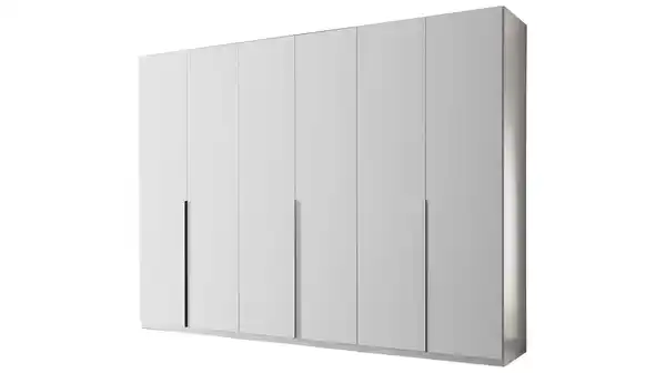 Das Design des Kleiderschranks ist bewusst klar und puristisch gehalten und wirkt dadurch besonders hochwertig. Die Front in weiß Hochglanz reflektieren das Licht auf elegante Weise und lassen selbst kleinere Räume heller und großzügiger erscheinen. Gleichzeitig sorgt die schlichte Farbgebung für eine ruhige, harmonische Atmosphäre im Schlafzimmer - perfekt, um zur Ruhe zu kommen. Die durchgehende Linienführung der 6 Türen unterstreicht den modernen Charakter des Schranks. Nichts wirkt verspielt oder überladen - stattdessen entsteht ein edles, fast schon architektonisches Gesamtbild. Gerade diese Zurückhaltung macht unser Kleiderschrank CAMOLEO so besonders. Das Möbelstück drängt sich nicht auf, sondern verleiht dem Raum eine stilvolle, luxuriöse Note. Ein echter Blickfang sind die schlanken Metallgriffleisten in Anthrazit. Sie setzen feine Akzente auf der glatten Hochglanzfläche und bringen eine dezente Eleganz ins Spiel. Der kühle Metallton harmoniert perfekt mit dem strahlenden Weiß und betont den zeitgemäßen Look.Mit einer beeindruckenden Breite von ca. 302 cm bietet dieser 6-türige Drehtürenschrank außergewöhnlich viel Platz für Kleidung, Accessoires und mehr. Hinter den stilvollen Türen verbirgt sich eine durchdachte All-in-Ausstattung, die Ordnung nicht nur einfach, sondern komfortabel macht. 6 Einlegeböden schaffen flexible Ablageflächen für Pullover, Shirts oder Bettwäsche, während 3 stabile Kleiderstangen ideal für Hemden, Blusen, Kleider oder Anzüge sind. Ein besonderes Highlight ist das mittlere Abteil mit praktischer T-Einteilung, das zusätzlichen strukturierten Stauraum bietet. Die innenliegenden 3 Schubladen sorgen für eine aufgeräumte Aufbewahrung von Wäsche, Accessoires oder kleinen Lieblingsstücken. Der integrierte Innenspiegel rundet die funktionale Ausstattung perfekt ab - ideal für den letzten Outfit-Check am Morgen. Bestellen Sie bequem über unseren Onlineshop Ihren neuen Kleiderschrank oder lassen Sie sich von unseren Experten beraten.