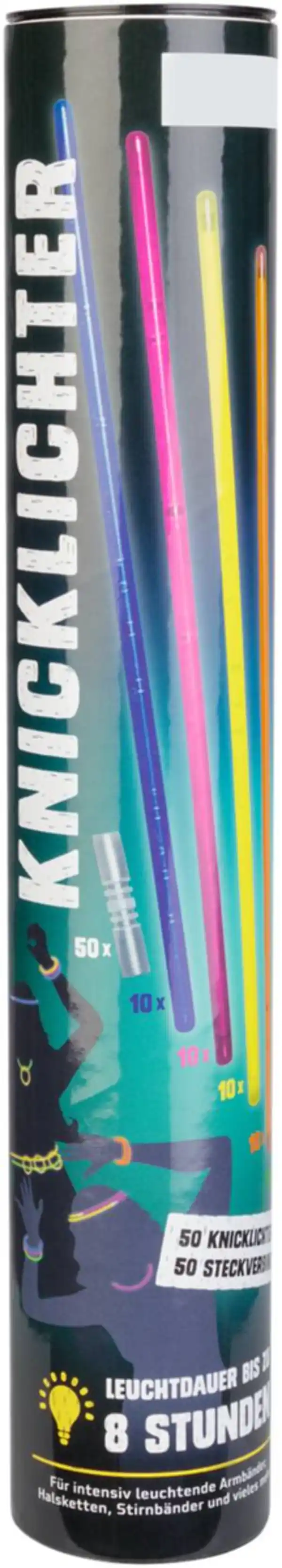 50 Knicklichter in 5 Farben > Für intensiv leuchtende Bänder und Ketten > Leuchtdauer bis zu 8 h > Inkl. 50 Steckverbindern