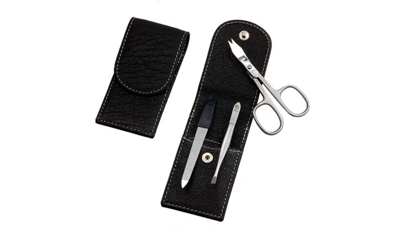 3-teiliges Manikür-Etui mit Druckknopf-Lasche aus schrumpfgegerbtem Büffeleder. Inhalt: drei hochwertige, antiallergene Nagelpflegeinstrumenten aus rostfreiem Edelstahl mit mattierter, blendfreier Oberfläche: - Nagelschere, gebogen; microgezahnte Schneide zum besonders sicheren und sauberen Schneiden der Nägel und mit feiner Turmspitze zum exakten Schneiden auch feinster Hautpartikel - Pinzette, schräg; einzeln haarfassend geschliffen - Saphir-Nagelfeile, 9 cm, mit einer groben Belagseite zum Kürzen und einer feinen zum Glätten der Nägel Maße: 105 x 55 x 16 mm