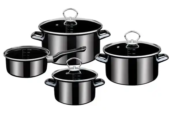Dieses Kochtopf-Set ist aus extra schwerem Stahl-Emaille gefertigt und verfügt innen über eine praktische Literskala. Zudem sind die Töpfe innen und außen leicht zu reinigen, schnitt- und kratzfest, sowie nickelfrei und daher ideal für Allergiker geeignet. Außerdem ist dieses Kochtopf-Set für alle Herdarten - auch für Induktion geeignet und besteht aus: Fleischtopf mit Glasdeckel ø 16 x H 9,5 cm, ca. 1,8 L / ø 20 x H 11,5 cm, ca. 3,4 L / ø 24 x H 13,5 cm, ca. 5,5 L / Stielkasserolle ø 16 x H 8,0 cm, ca. 1,5 L. spülmaschinengeeignet.