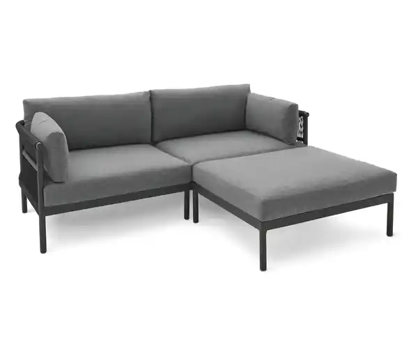 Komfortables Gartensofa mit separatem Hocker Farbe: Gestell dunkelgrau Bezug mittelgrau Geflecht anthrazit, hellgrau gesprenkelt Material: Gestell Aluminium, pulverbeschichtet Beschläge und Schrauben Stahl, verzinkt und pulverbeschichtet Bezug 100% Polyester Polsterfüllung Polyurethan und Polyester Textilgeflecht und Bodenschoner Polypropylen Maße: B x H x T Sofa ca. 187 x 73,2 x 76,1 cm Sitztiefe ca. 70 cm B x H x T Ottomane ca. 92,5 x 36,2 x 75,8 cm Sitzhöhe inkl. Kissen ca. 36,2 cm, ohne Kissen ca. 25,7 cm Höhe Armlehnen ca. 61,9 cm Inhalt: Inkl. Bodenschonern, Sitz- und Rückenkissen, Montageanleitung und -material Gewicht: Sofa ca. 21 kg Fußhocker ca. 7 kg Tragkraft: Sofa Sitzplätze 2x je max. 120 kg Fußhocker max. 120 kg Gebrauchsanweisung: UV- und witterungsbeständig Polsterbezug abziehbar und bei 40 °C waschbar Kissen trotz ihrer witterungsbeständigen Eigenschaften bei Regen, Schnee oder Frost in unserer Aufbewahrungstasche, einer Kissenbox oder im Innenbereich aufbewahren. Zur Lagerung in Aufbewahrungstasche oder Kissenbox sollten die Kissen trocken sein. Sonstige Hinweise: Artikel wird zerlegt geliefert Lieferung in 3 Packstücken B x H x T Packstücke 1x ca. 98 x 23,5 x 79,5 cm, 1x ca. 97 x 44,5 x 78,5 cm, 1x ca. 96,5 x 44,5 x 78,7 cm Gewicht Packstücke 1x ca. 9,5 kg, 1x ca. 15,3 kg, 1x ca. 14,5 kg Besonders bequem durch extratiefe Sitzfläche und dicke KissenFußhocker separat oder bündig am Sofa stellbar, mit Klettband fixierbarKomfortabler Sitzplatz für bis zu 3 PersonenGestell aus rostresistentem Aluminium, besonders langlebig, pflegeleicht und witterungsbeständigRückenlehne mit witterungsbeständigem, schnelltrocknendem TextilgeflechtPolsterbezüge aus hochwertigem Polyester, Haptik und Optik erinnern an einen Indoor-StoffPolsterbezüge abziehbar und bei 40 °C waschbarSitzpolster mit Klettschlaufen am Gestell fixierbarUV- und witterungsbeständig