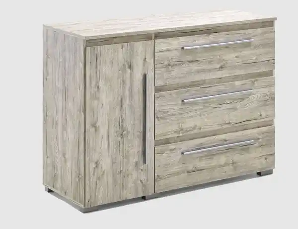 Chic sowie platzsparend wirken und doch viel Stauraum bieten. Das sind die Hauptmerkmale einer Kommode. 3 Schubkästen und eine Tür sorgen bei unserer Kommode Bali für ausreichend Platz. Die Trendfarbe eiche/sand sowie die langen Griffe aus grauem Kunststoff sorgen für einen tollen modernen Look.