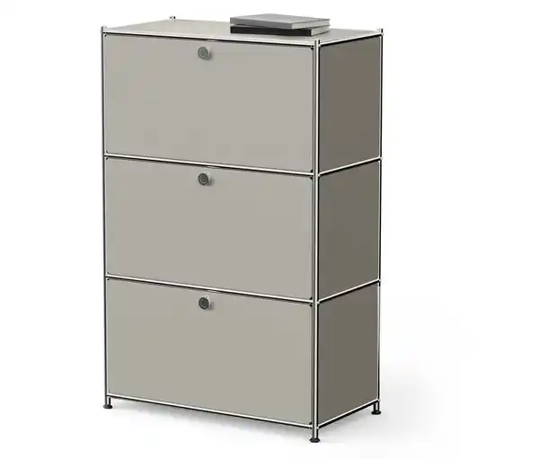 Kommode Metall »CN3« mit 3 Klappenfächern, hellgrau Farbe: Flächen matt hellgrau Gestell chromfarben Material: Gestell Stahl verchromt Regalwände, -böden und -klappen Stahl, pulverbeschichtet Griffe Aluminium, verchromt Füße Kunststoff Verbindungsteile Kunststoff, verchromt Maße: B x H x T ca. 77 x 120,5 x 40 cm B x H x T Klappenfächer innen je ca. 73 x 36,5 x 36,5 cm Inhalt: Inkl. Wandbefestigung, Bodenschonern, Montagematerial und -anleitung Tragkraft: Einlegeböden je max. 40 kg Klappen je max. 5 kg Technische Details: Regalfüße sind höhenverstellbar Sonstige Hinweise: Artikel wird zerlegt geliefert Lieferung in 2 Packstücken Ein Element unserer »CN3«-Metall-Möbel-SerieVielseitig mit weiteren Elementen der Serie kombinierbar3 Klappen mit je 2 hochwertigen Metall-ScherenscharnierenOberflächen mit hochwertiger, strapazierfähiger PulverbeschichtungVerchromtes Metallgestell und KnaufgriffeInkl. höhenverstellbarer Kunststofffüße – fester Stand auch auf unebenen Flächen