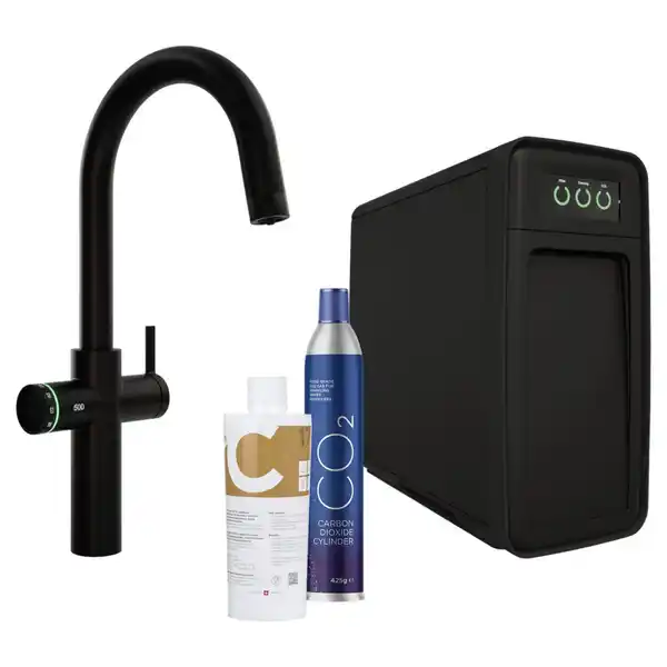 Erfrischend anders: Diese Küchenarmatur mit Trinkwassersystem in Schwarz vereint normales Leitungswasser und prickelndes Sprudelwasser in einem eleganten Design. Schluss mit dem Kistenschleppen – genießen Sie gefiltertes, gekühltes und kohlensäurehaltiges Wasser direkt aus dem Hahn. Alle Funktionen auf einen Blick Trinkwassersystem mit Sprudelwasser-Funktion (2 Kohlensäure-Stufen wählbar) Wasserarten: normales Kalt- und Warmwasser sowie gefiltertes, gekühltes und kohlensäurehaltiges Wasser Kühlleistung: ca. 4 bis 10 °C Maße Untertischgerät: ca. 20 x 43,9 x 51,6 cm (B x H x T) Ausladung Armatur: ca. 22,5 cm Festauslauf Antikalk-Strahlregler für pflegeleichten Betrieb eingebautes Geräteabsperrventil flexible Anschlussschläuche Material: Kunststoff und Metall Farbe: Schwarz Innovative Bedienung per Touchscreen und LED-Ring Das Trinkwassersystem überzeugt mit einer intuitiven Bedienung: An der Armatur wählen Sie über einen Touchscreen die gewünschte Wasserart und das Volumen aus. Ein LED-Ring signalisiert den aktuellen Status. Der Bedienhebel verfügt zusätzlich über eine praktische Wassersparfunktion – so schonen Sie Ressourcen im Alltag. Das Untertischgerät ist mit einem weiteren Touchscreen ausgestattet, der Ihnen Statusanzeigen zu Filter, Reinigung und CO2-Behälter liefert. Platzsparendes Untertischgerät mit integrierter Filtertechnologie Das kompakte Untertischgerät mit integriertem CO2-Behälter und Filter verschwindet diskret unter der Spüle und beansprucht nur minimalen Platz. Die Filtertechnologie reduziert organische Verunreinigungen, Chlo