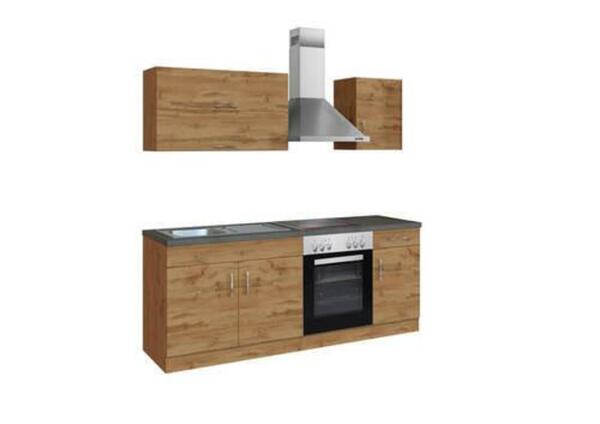 Dieser Artikel ist NUR ONLINE erhältlich! Dieser Küchenblock in Anthrazit und Eichenfarbe sorgt auch in Ihrer Küche für ein Ambiente zum Wohlfühlen und wartet zudem mit einem praktischen E-Geräteset auf. Die geradlinige Optik und harmonische Farbgestaltung machen die ca. 210 x 200 x 60 cm (B x H x T) große Küchenzeile aus MDF zur optimalen Wahl. Korpus, Front und Sockel in Eichenfarbe werden von einer Arbeitsplatte in Anthrazit und alufarbenen Bügelgriffen ergänzt. Die Oberfläche ist melaminharzbeschichtet, somit kratzfest und pflegeleicht. Der Küchenblock bietet Ihnen viel Stauraum für Lebensmittel und Kochzubehör. Im Lieferumfang sind eine Spüle enthalten sowie folgende E-Geräte: Dunstabzugshaube, Einbauherd und Cerankochfeld. Armaturen, Beleuchtung und Deko sind separat erhältlich. Außerdem ist die Küche individuell planbar, so schaffen Sie sich einen ganz persönlichen Ort, wo man gerne zusammenkommt. HINWEIS Dieser Artikel wird in unseren Filialen nicht ausgestellt, ist dort jedoch einfach und bequem bestellbar und wird direkt zu Ihnen nach Hause geliefert.