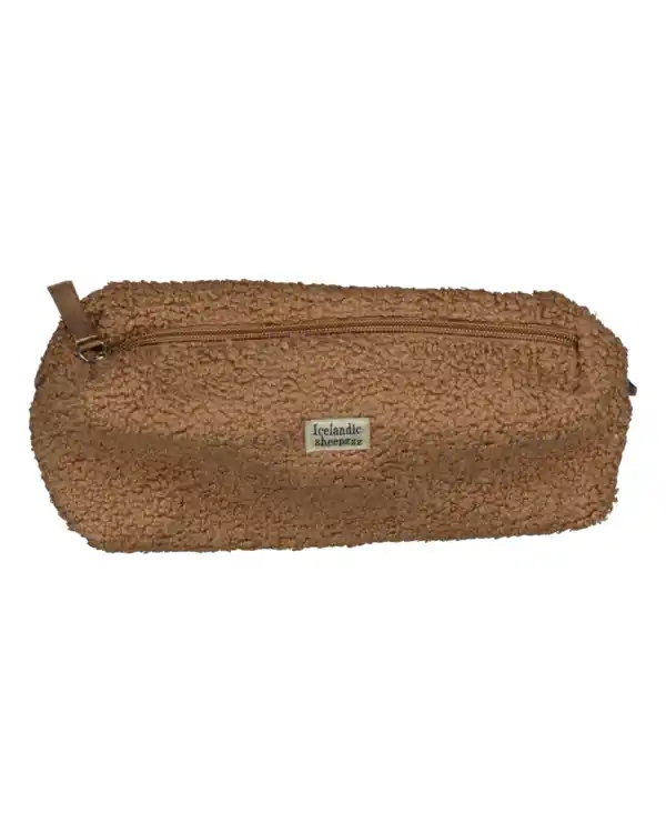 Diese Kulturtasche in der Farbe Braun ist aus weichem Teddy-Stoff gemacht. Die Tasche hat oben einen Reißverschluss und ein Etikett mit Text auf der Vorderseite. Durch das große Hauptfach kannst du deine Toilettenartikel einfach verstauen. Das Material fühlt sich angenehm an und lässt sich gut reinigen. Praktisch für Damen und Herren, die ihre Sachen übersichtlich mitnehmen möchten.