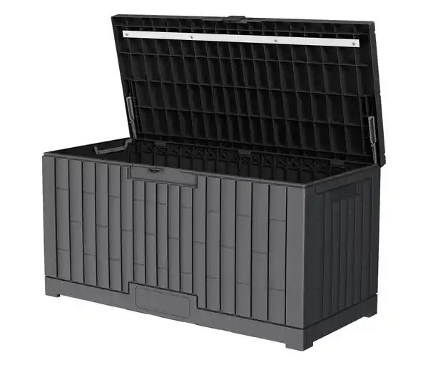 Kunststoff-Kissenbox, 375 l Material: Truhe Polypropylen. Winkel Aluminium Maße: B x H x T außen ca. 58,5 x 62 x 123 cm. B x H x T innen ca. 54 x 58 x 118 cm Inhalt: Inkl. 2 Winkeln und Aufbauanleitung Gewicht: Gewicht ca. 13 kg Füllmenge: Füllmenge ca. 375 l Gebrauchsanweisung: Nicht als Sitzplatz geeignet Sonstige Hinweise: Artikel wird zerlegt geliefert. Lieferung in 1 Packstück per Postversand Ideal auch für Spielzeug und UtensilienJede Menge Stauraum mit einem Fassungsvermögen von 375 lAus robustem Kunststoff, für den Gebrauch im Freien geeignetRustikales, an Holzplanken angelehntes DesignEinfach und schnell mit wenigen Handgriffen zusammengesteckt und aufgebautWetterbeständige Aufbewahrungsmöglichkeit ohne Pflegeaufwand