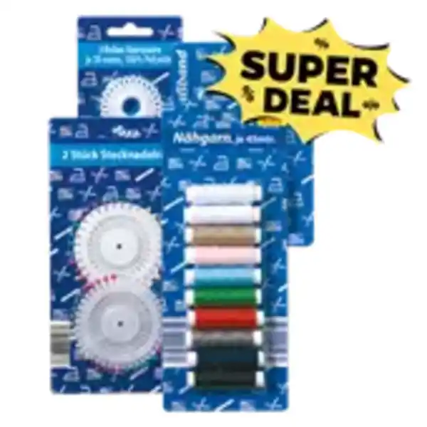 versch. Sorten, z. B. Sternzwirn, Stecknadeln, 10er-Pack Nähgarn oder Nadeleinfädler