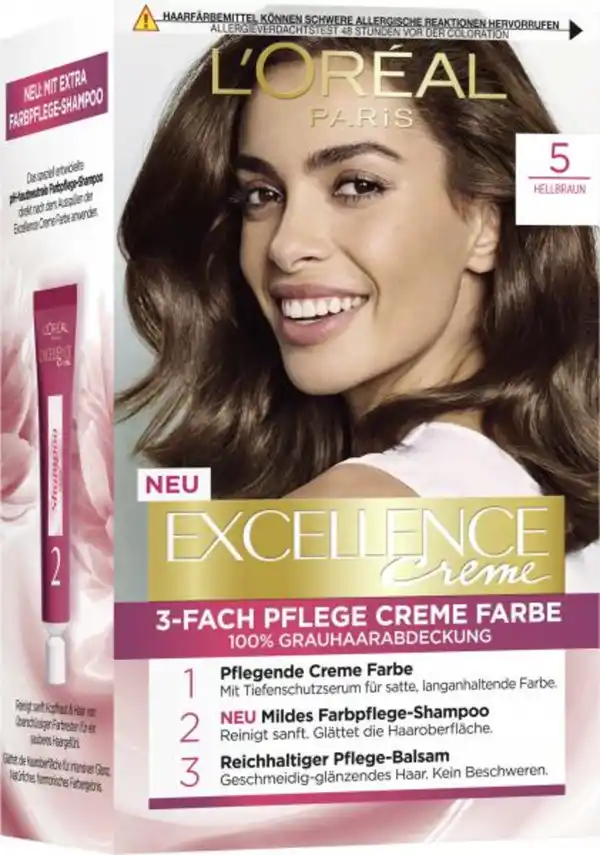 Intensiv gepflegtes Haar ist die beste Basis für ein reiches Farbergebnis. Die bewährte Pflege-Coloration Excellence Creme von L‘Oréal Paris zeichnet sich durch seine pflegende und aufbauende Wirkung aus. Das Ergebnis: Reiche, strahlende, langanhaltende Farbe. Die Coloration ermöglicht 100% Grauhaarabdeckung und kräftiges, volles Haar.
