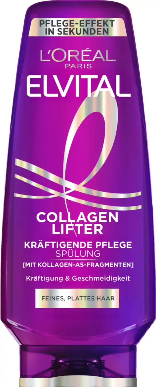 Elvital Collagen Lifter Kräfigende Pflegespülung liefert in Kombination mit Shampoo und Spray lang anhaltendes Volumen und Glanz. Cremige Formel, angereichert mit Kollagen-AS-Fragmenten, um den Ansatz zu liften und die volumisierende Wirksamkeit zu maximieren. Hydriert das Haar, während es kräftigt, ohne zu beschweren. Bietet mehr Volumen, das tagelang hält. Angereichert mit Birnen-, Zitrus- und Rosenduft für ein sinnliches Haarpflegeerlebnis. Einfache Anwendung: Auf nasses Haar auftragen, eine Minute einwirken lassen, gründlich ausspülen. Für optimale Ergebnisse verwende Elvital Collagen Lifter Shampoo und Volumen Spray. Ideal für feines oder plattes Haar, das Dicke, Weichheit und langanhaltendes Volumen benötigt.