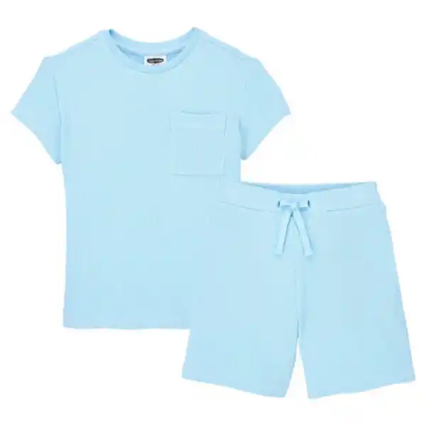 \n- Je Set - Größen: 98/104 - 122/128 - Verschiedene Modelle: - Modell 1: Blau - Modell 2: Grün - Modell 3: Dunkelblau - 100 % Baumwolle, Waffel-Pique Struktur - Wäsche vor Gebrauch waschen. Bitte mit ähnlichen Farben auf links waschen und bügeln - Oberteil: - Brusttasche auf der Vorderseite - Relaxed Fit, untere Hüftlänge, kurzarm - Hose: - Taschen - Dekorativer Kordelzug ohne loses Ende - Mit verstellbarem Knopf am Bund - Relaxed Fit, kurze Länge, mittlere Hüftlänge