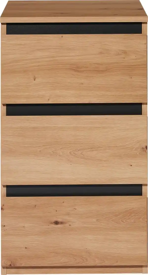 Oberflächen in Eiche-Artisan-Nachbildung > Mit Melaminharzbeschichtung > Kratzfest und pflegeleicht > Mit 3 geräumigen, leichtgängigen Schubladen > Belastbarkeit Ablagefläche max. 10 kg > Belastbarkeit je Schublade max. 5 kg > Mit bodenschonenden Möbelgleitern > Größe ca. B 40 x H 78 x T 48 cm > Inkl. Montagematerial und Anleitung