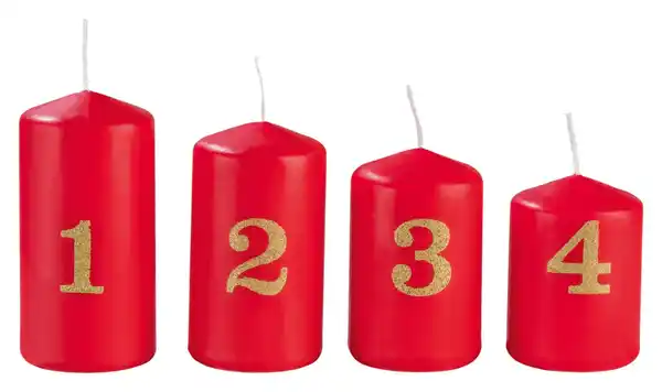 Aus Paraffin > Premiumqualität > Mit Zahlen für den 1. bis 4. Advent > Durchmesser ca. 5 bzw. 6 cm > Höhen ca. 5 bis 11 cm