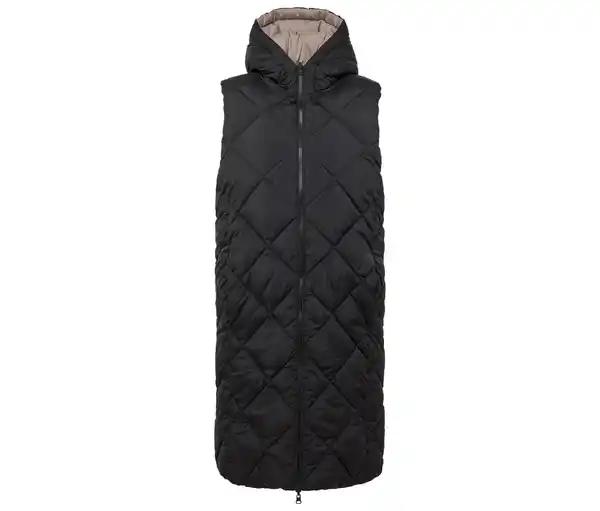 Lange wendbare Steppweste Farbe: 1 Seite schwarz, 1 Seite beige Material: 100% Polyester Maße: Gesamtlänge ca. 101 cm (Gr. 40) Passform: Regular Fit Eine Weste, zwei Looks1 Seite schwarz, 1 Seite beigeDiamantsteppung auf der einen Seite, gerade Steppung auf der anderen SeiteSeitliche Eingrifftaschen auf beiden SeitenKapuze mit KordelzugLeichte, wärmende Wattierung2-Wege-Reißverschluss