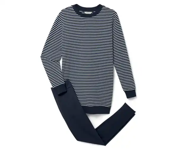 Leggings-Pyjama Farbe: Oberteil dunkelblau-creme gestreift Leggings dunkelblau Material: Oberteil 60% Baumwolle (Unterstützt die Initiative Cotton made in Africa), 40% Polyester Leggings 95% Baumwolle (Unterstützt die Initiative Cotton made in Africa), 5% Elasthan Maße: Oberteil Gesamtlänge ca. 82 cm (Gr. M 40/42) Hose Innenbeinlänge ca. 67 cm Passform: Regular Fit Oberteil aus weicher Baumwoll-MischqualitätLeggings mit elastischem Bund Schlafanzug mit hochwertigem Markenelasthan für Langlebigkeit und hohe WaschbeständigkeitUnterstützt die Initiative Cotton made in Africa