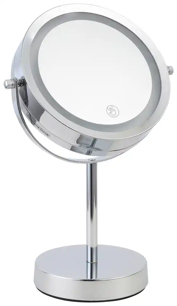 Genießen Sie die perfekte Helligkeit zum schminken, rasieren, zupfen und reinigen - und das überall und jederzeit. Denn dieser praktische Leuchtspiegel aus chromfarbenem Metall ist batteriebetrieben und somit überall einsetzbar. Der etwa 21 x 32 cm (D x H) große Spiegel ist mit einem 3 Watt LED ausgestattet und punktet mit kaltweißem Licht per Touchsensor. Der Spiegel ist 360° neigbar und mit insgesamt 4 AA-Batterien betrieben. Zudem bietet er eine 5-fache Vergrößerung - perfekte Sichtverhältnisse also. Der Leuchtspiegel wird ohne Batterien geliefert.
