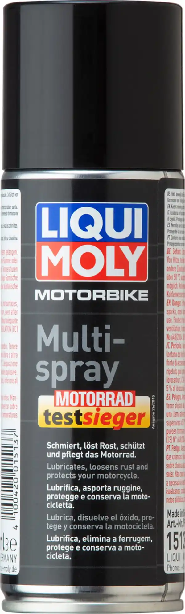 Liqui Moly Motorbike Multispray 200 ml ist der perfekte Allrounder für Pflege, Schutz und Wartung rund ums Motorrad. Das vielseitige Multispray schmiert bewegliche Teile, macht Bowdenzüge, Scharniere und Gelenke wieder leichtgängig und stoppt Quietsch- und Knarrgeräusche. Gleichzeitig löst es Rost, verdrängt Feuchtigkeit und schützt elektrische Kontakte zuverlässig – ideal nach Regenfahrten oder der Wäsche. Dank hervorragendem Kriechvermögen erreicht es auch schwer zugängliche Stellen und bietet einen wirksamen Korrosionsschutz. Die materialschonende Formel ist dabei neutral gegenüber Lacken, Kunststoffen und Gummi. Für alle, die ihr Bike schnell, einfach und effektiv in Topform halten wollen.