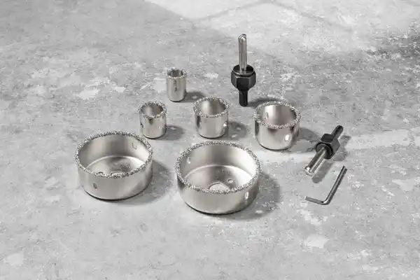Kraft Werkzeuge Lochsägen mit Karbid-Körnung, 9tlg. Max. Sägetiefe: 25 mm Zentriebohrer: 40Cr+YG8 Sechskantschlüssel: Karbonstahl Oberfläche: vernickelt, silbern Material: Lochsägen: Karbonstahl + Karbid-Zähne Adapter: Karbonstahl Maße Ø: 22, 28, 35, 44, 68 & 73 mmLieferumfang 1x 6,7mm Sechskant-Schaft Adapter mit TCT Zentrierbohrer 1x 9,4mm Sechskant-Schaft Adapter mit TCT Zentrierbohrer 1x Sechskantschlüssel: 2,5 mm 1x je Ø: 22, 28, 35, 44, 68 & 73 mm