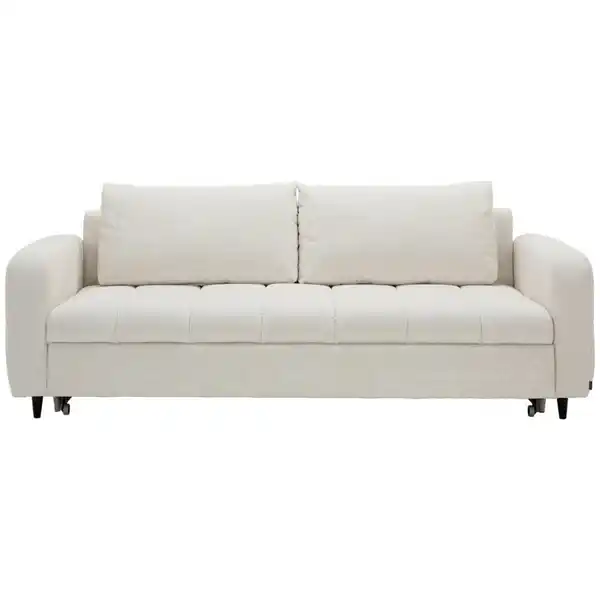 Erholen, feiern, spielen – dieses Lomoco Schlafsofa in Perlmuttfarben ist Ihre verlässliche Konstante in allen Lebenslagen. Gut zu wissen: B x H x T: ca. 236 x 88 x 101 cm Anzahl der Sitzplätze: ca. 3 Sitzfläche: ca. 196 x 83 cm (B x T), Sitzhöhe: ca. 45 cm maximale Belastbarkeit: ca. 120 kg Liegefläche der Bettfunktion: ca. 153 x 196 cm (B x L), Liegehöhe: ca. 45 cm Armlehnen: ca. 20 x 65 cm (B x H) Fußhöhe: ca. 10 cm Rückenkissen: ca. 100 x 47 cm (L x H) Spürbare Qualitäten Der Bezug, hergestellt aus Synthetikfaser (ca. 100 % Polyester) mit Flachgewebe-Oberfläche, ist robust, fühlt sich fein an und weist eine gute Abriebfestigkeit sowie eine nur geringe Pillingbildung auf. Eine bequeme Schaumstoff-Polsterung mit Wellenunterfederung, die zu tiefes Einsinken verhindert, unterstützt den Körper und fördert den Komfort. Der stützende und punktelastische Vollschaum erfreut alle Allergiker. Eine hohe Materialdichte sowie ein guter Wärme- und Feuchtigkeitstransport vervollständigen dessen Vorzüge. Die Schlaffunktion macht das Sofa multifunktional, da es so auch als einladendes Bett für Übernachtungsgäste dienen kann. Sehenswerter Hingucker Die freundliche Farbgebung in Perlmuttfarben verleiht dem Möbel einen harmonischen Look und fügt sich schick in verschiedene Einrichtungstrends ein. Das Design wird durch die konischen Füße aus lackierter Buche in Schwarz adäquat vervollständigt. Im Lieferumfang enthalten: Schlaffunktion Rückenkissen (Füllung: Silikon / Schaumstoffflocken) Können Sie sich etwas Besseres vorstellen als auf diesem perlmuttfarbenen Schlafsofa mit Flachgewebe-Bezug alles um