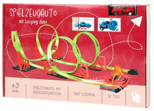 Sobald das aufgezogene Auto losgelassen wird, schießt es über die Rennbahn durch großen Loopings durch den Feuerreifen ins Ziel.
