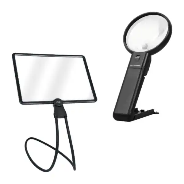 LED-Lupe HL-90 MR-LED, bikonvexe Acryllinse, Vergrößerung 2-fach und 4,5-fach (Bifokus); Ganzseitenlupe WPM-1, Vergrößerung 1,8-fach