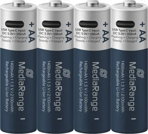 Li-Ion-Technologie > Kapazität 1.400 mAh > Per USB-C aufladbar > Bis zu 1.200 Ladezyklen > Inkl. 4-zu-1-USB-Ladekabel