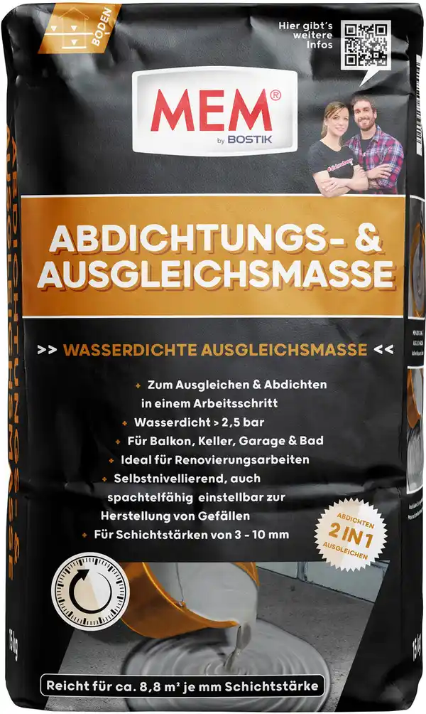 MEM Abdichtungs- & Ausgleichsmasse ist eine selbstnivellierende und wasserdichte zementäre Spachtelmasse für Garagen, Keller, Balkone, Terrassen und Nassräume. MEM Abdichtungs- & Ausgleichsmasse ist Abdichtung und Spachtel-masse in einem Produkt und führt so zu einer deutlichen Zeitersparnis. Kann in Schichtstärken von 3 bis 10 mm in einem Arbeitsgang aufgebracht werden. Auch spachtelfähig einstellbar zur Herstellung von Gefällen. Ideal einsetzbar für Renovierungsarbeiten. Geeignet im Innen- und Außenbereich und auch für Fußbodenheizungen. Mit üblichen Belägen und Fliesen überarbeitbar.Einsatzbereich: Innen und AußenAnwendungsbereich: BodenFarbe: grauInhalt: 15 kgAnmischverhältnis: 2,1 Liter Wasser auf 15 kg PulverSchichtdicke: 3 - 10 mmVerarbeitungstemperatur: +5°C bis +30°CVerarbeitungszeit: ca. 30 MinutenBegehbar nach: 4- 6 StundenMaterialbasis: Es handelt sich um ein Zementprodukt, das im