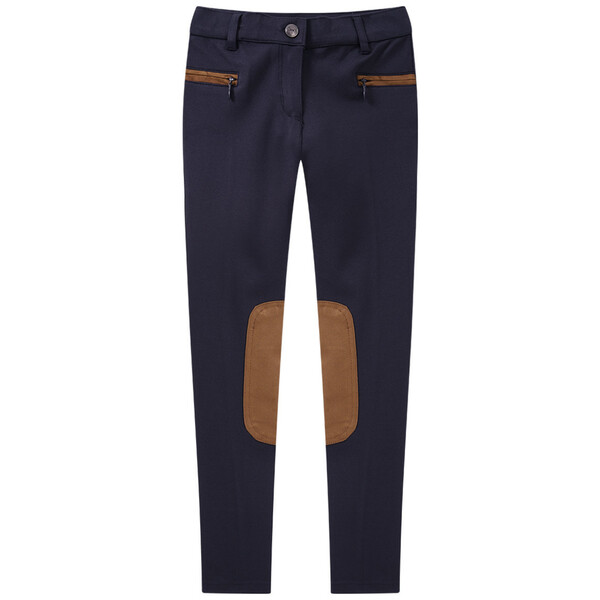 Authentisches Outfit! Dunkelblaue Hose aus elastischem Viskose-Mix mit Knopf, Reißverschluss und fünf Gürtelschlaufen am verstellbaren Bund. Zwei imitierte Reißverschlusstaschen vorne. An den Hosenbeinen mit braunen Aufnähern in Velours-Optik und Ziernähten hinten für den perfekten Reiter-Look.