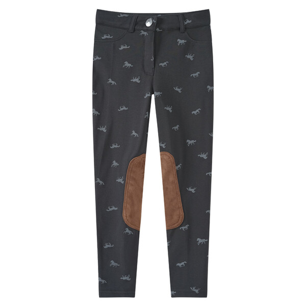 Auf zu den Pferden! Dunkelgraue Hose aus elastischem Viskose-Mix mit Pferde-Motiv allover bedruckt. Mit Knopf, Reißverschluss und fünf Gürtelschlaufen am verstellbaren Bund. Zwei imitierte Taschen vorne. An den Hosenbeinen mit braunen Aufnähern in Velours-Optik und Ziernähten hinten für den perfekten Reiter-Look.