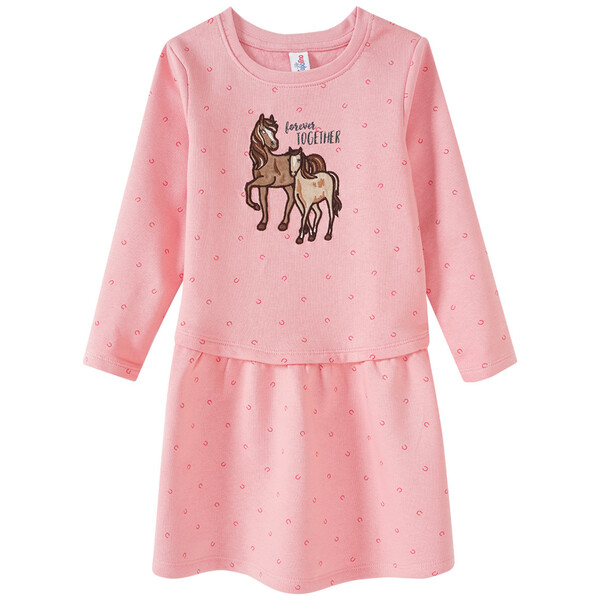 Für immer zusammen! Rosa Kleid mit pinkem Hufeisen-Allover und großer Pferde-Applikation auf der Front. Am Rundhalsausschnitt mit angesetztem Rippenbündchen und in der Taille mit elastischer Raffung. Rockteil leicht ausgestellt geschnitten. Innen weich angeraut. Cotton made in Africa setzt sich für einen ökonomisch, sozial und ökologisch nachhaltigeren Baumwollanbau in Subsahara-Afrika ein und trägt damit zu einer Verbesserung der Lebensbedingungen kleinbäuerlicher Familien bei.