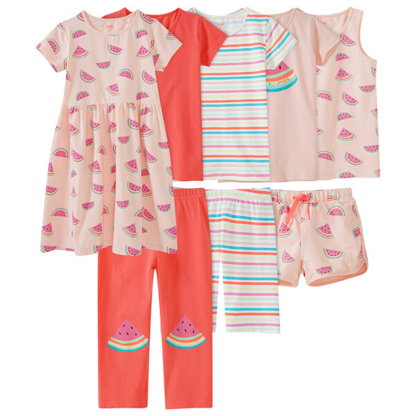 Fröhlich kombinierbar! Mega-Multipack bestehend aus drei T-Shirts, einem Kleid, einem Top, einer Capri-Leggings, einer Radler und einer Shorts. Ein weißes T-Shirt mit bunten Streifen, eins in Hellrosa mit Melonen-Print auf der Front und eins in unifarben Koralle. Jeweils mit paspeliertem Rundhalsausschnitt. Ein Kleid in Hellrosa mit Melonen-Allover, paspeliertem Rundhalsausschnitt und ausgestelltem Rockteil. Ein Top in Hellrosa mit Melonen-Allover, paspelierten Ausschnitten und breiten Trägern. Eine Capri-Leggings in Koralle mit Melonen-Print im Kniebereich und elastischem Bund für einen guten Sitz. Eine weiße Radler mit bunten Streifen und elastischem Bund für einen bequemen Sitz. Eine hellrosa Shorts mit Melonen-Allover und verstärkten Ösen sowie Tunnelzug mit neonpinker Kordel im Elastikbund. An den Beinausschnitten mit Paspel und innen leicht angeraut. Der Organic Content Standard (OCS) ermöglicht es Unternehmen den genauen Anteil an ökologischem Material in einer Ware zu erfassen und durch die Produktionskette weiter zu verfolgen.